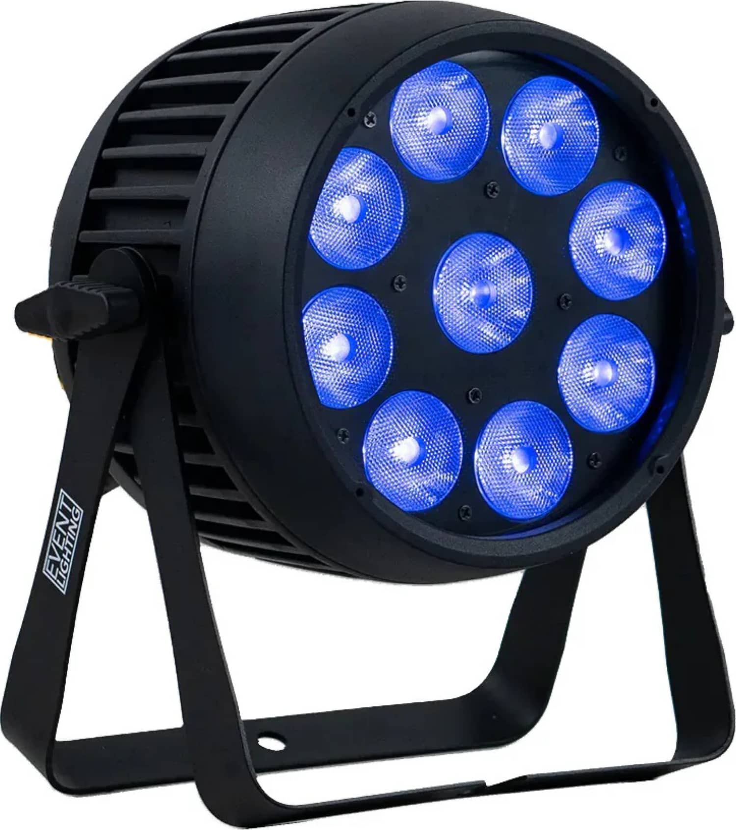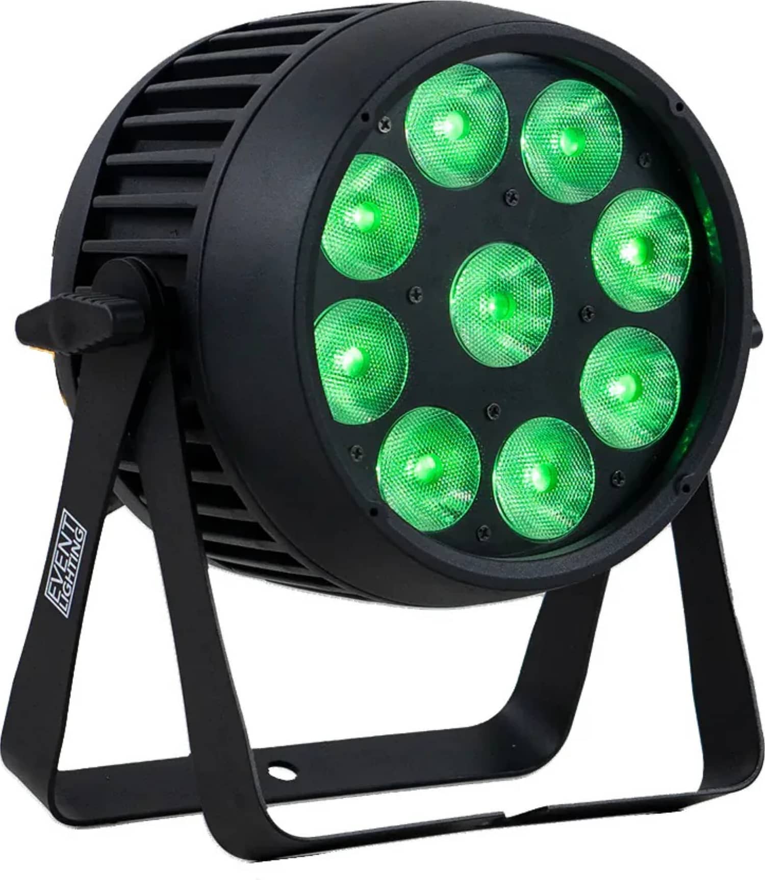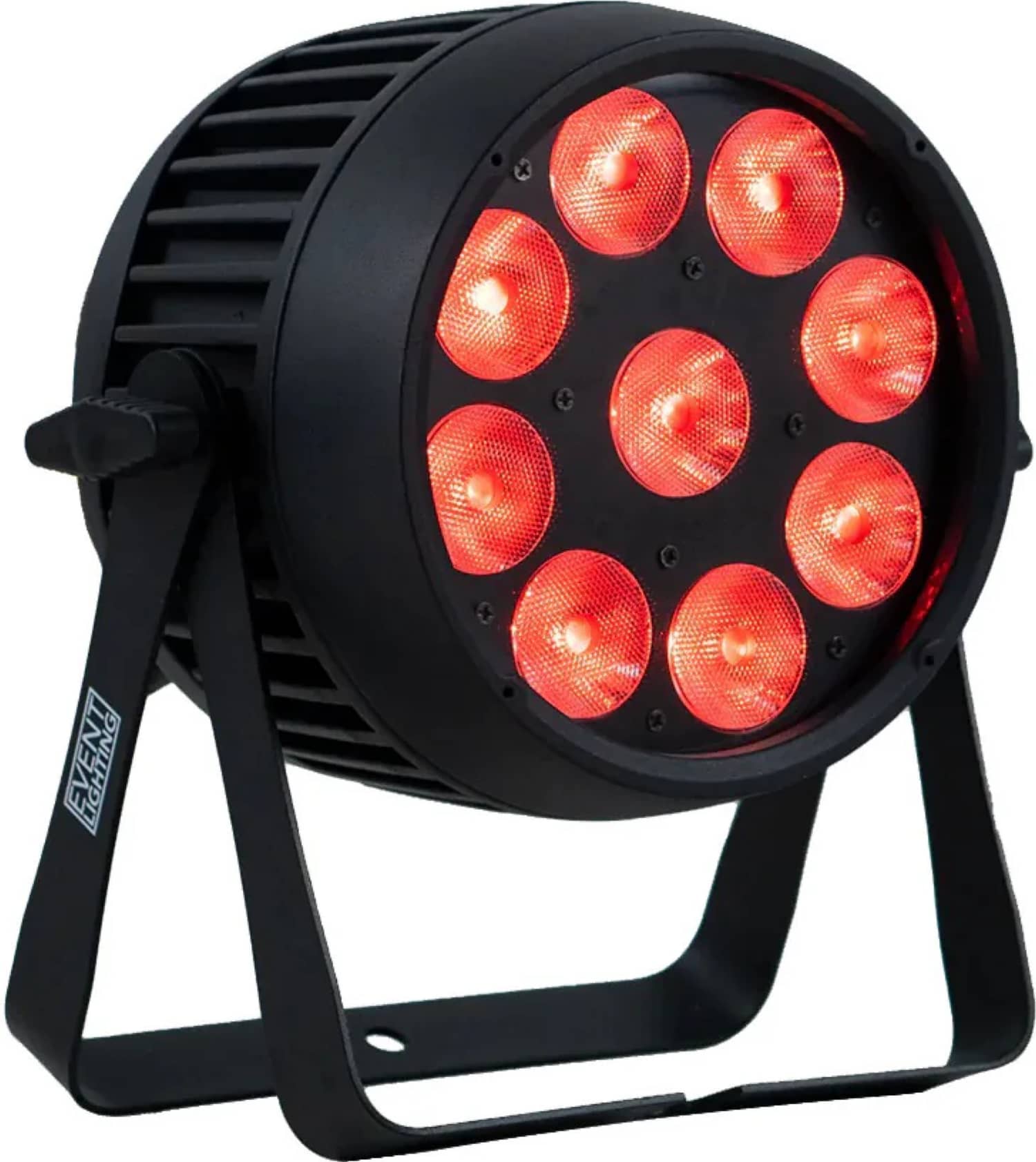 Battery powered outdoor wash light with 9 x 12w RGBWAU LED’s. Perfect for lighting tree’s building or stages outside where power is limited or running cables is difficult.